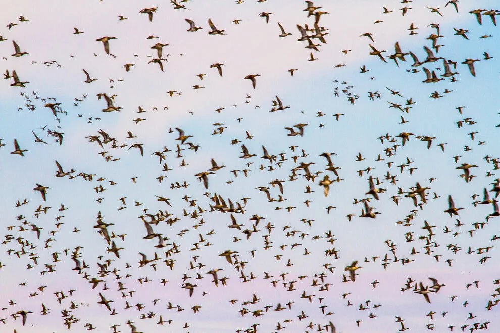 A mixed group of ducks migrates over a marsh. Photo by Evalyn Bemis for Audubon Photography Awards