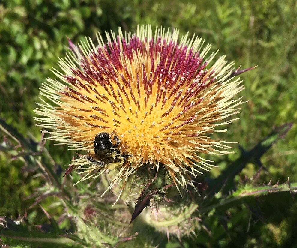 A bee found pollinating Yellow Thistle with pollen grains stuck to it.