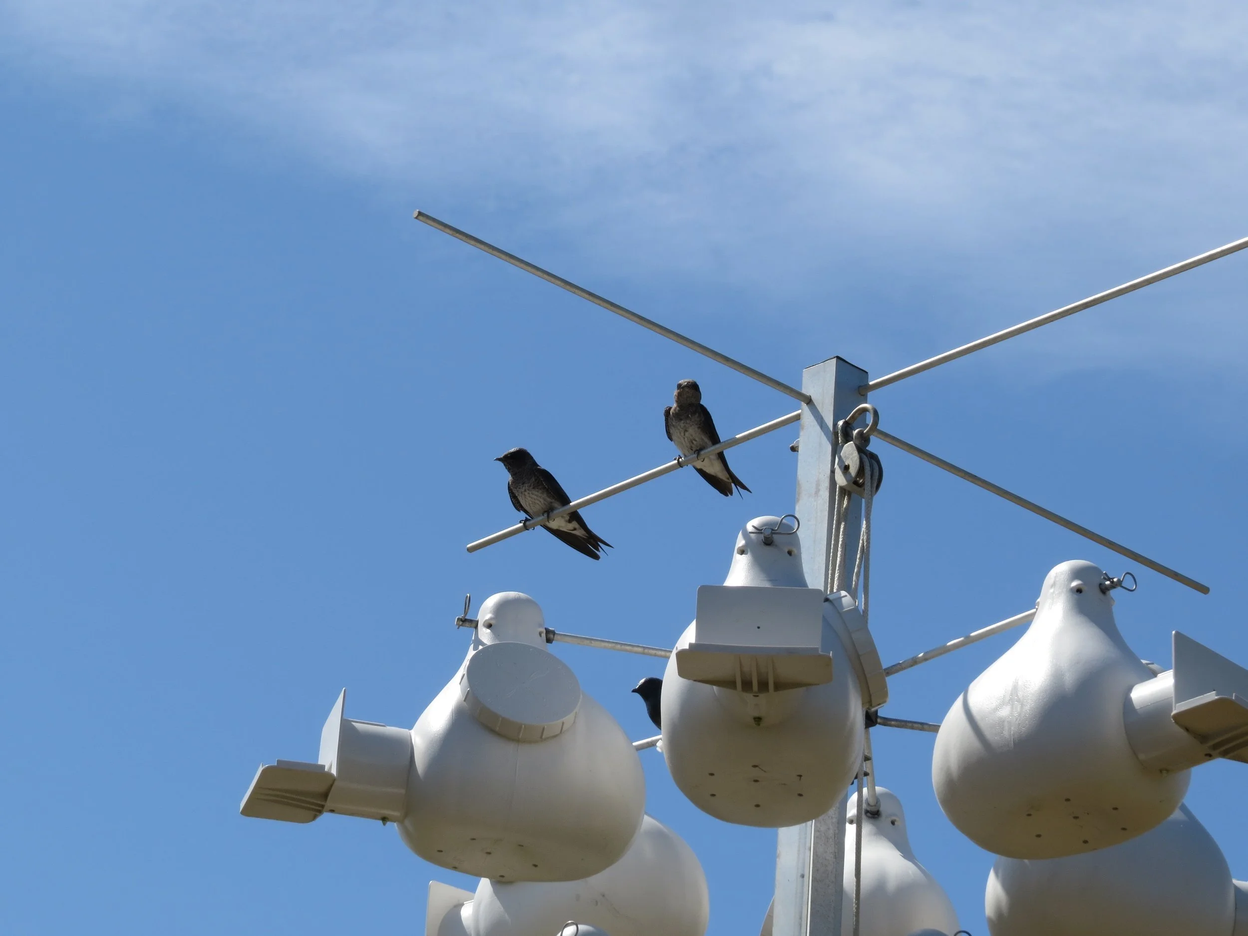 Purple Martin pair on the gourds at LLNF. Photo by Libby Buck